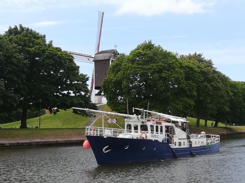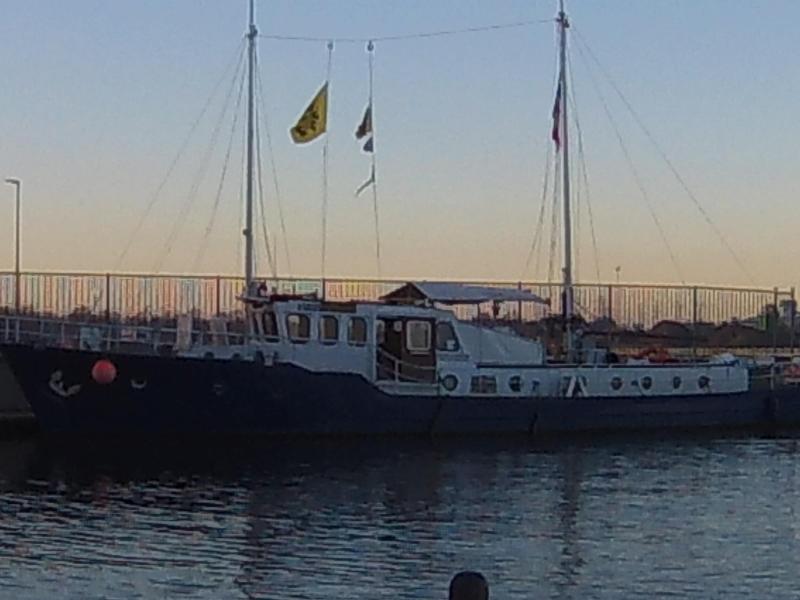 Het schip heeft een donkerblauwe romp en een witte opbouw met een stuurhut en twee masten op het dek. Binnenin bevinden zich kajuiten met woonruimte en slaapplaatsen, afgewerkt met hout voor een warme uitstraling. De constructie is volledig in staal.